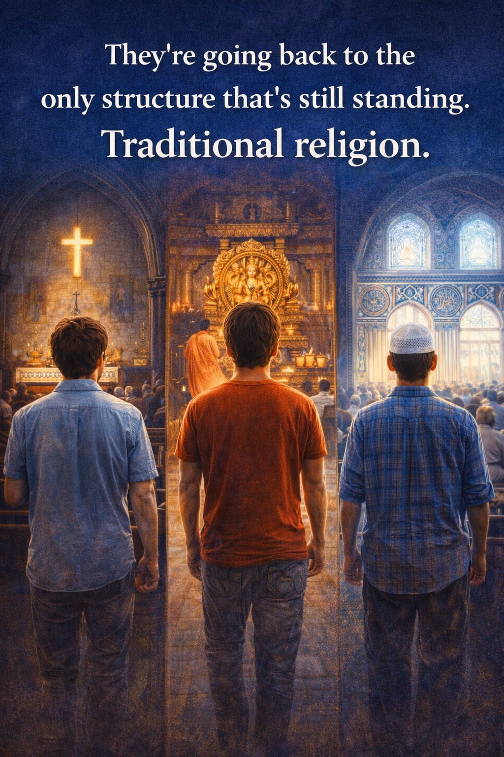 Forty-two percent of young men between eighteen and twenty-nine now say religion is very important to them. That’s up fourteen points from just two years ago. They’re not saying spirituality. They’re not saying mindfulness or meditation or personal growth. They’re saying religion. And for the first time in twenty-five years, young men have surpassed young women on this measure. Church attendance among young men is up too — forty percent now report going at least monthly.